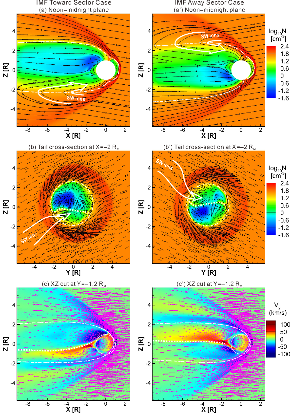 图 3 MHD全球模拟结果。(a,a')磁场线在子午面的投影;(b,b') X=−2 RM处YZ剖面上的磁场向量及离子密度;(c,c') Y=−1.2 RM处XZ剖面上的离子速度向量。(a-c):位于行星际磁场向阳扇区;(a'-c'):位于行星际磁场背阳扇区。白色箭头:太阳风离子沿磁力线注入近磁尾示意