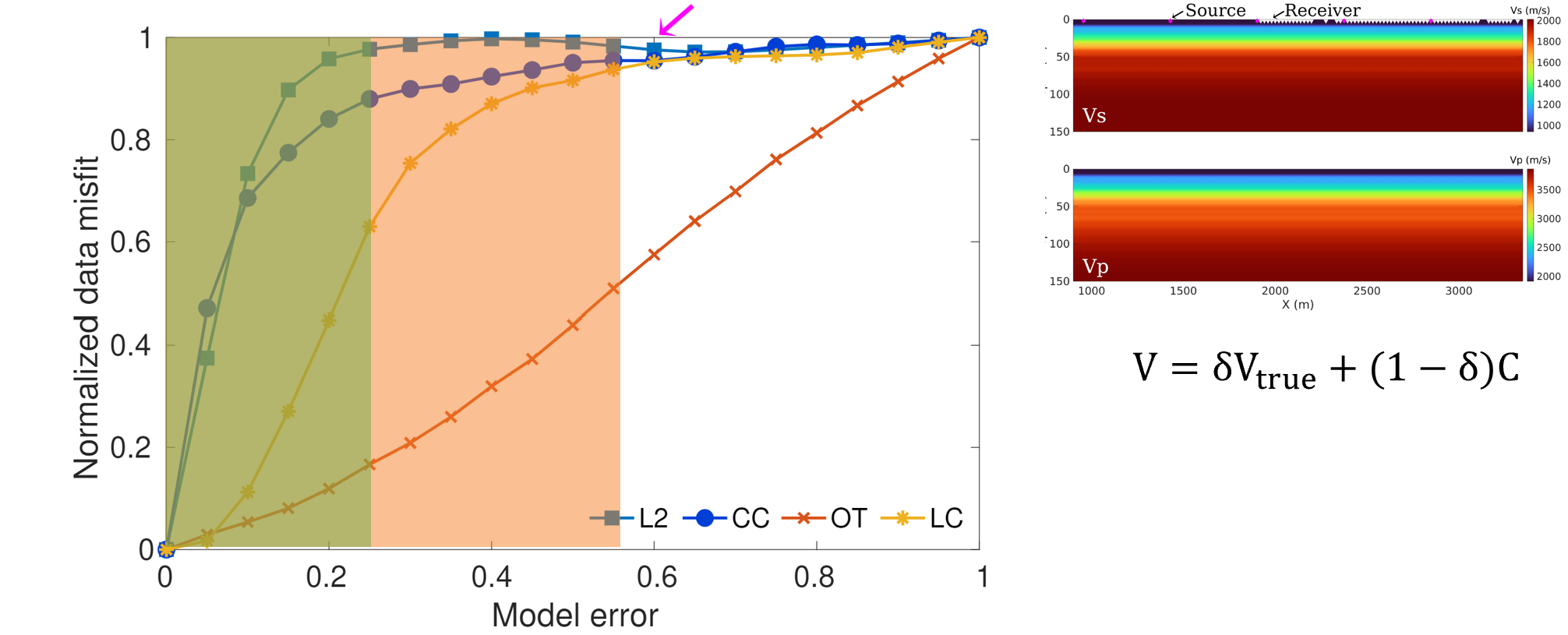 中国科学院地质与地球物理研究所深层油气理论与智能勘探开发重点实验室张振东特聘研究员、刘伊克研究员联合沙特阿卜杜拉国王科技大学Tariq Alkhalifah教授,提出了波动方程地震面波全频散谱反演方法。该方法将传统一维面波频散曲线反演方法和最新的地震全波形反演理论相结合,通过数值方法求解弹性波波动方程模拟地震面波在任意复杂介质中的传播过程,避免了传统方法对地下结构的层状模型近似;将复杂的地震面波波形变换到保留其频散特征的频散谱域进行数据比较(图1),避免了拾取频散曲线且可以自动利用各阶频散信息;提出了频散谱相减、频散谱全局互相关、频散谱最优输送和频散谱局部互相关四种目标函数,比较了不同目标函数的凹凸性、找到了一种全局最优目标函数(图2)。借助全波形反演统一理论框架,使用伴随状态法计算速度模型梯度和局部优化算法迭代更新速度模型,可实现大规模地震资料的自动处理。该反演思想可推广至一般反问题,即将复杂的地震波形变换到保留其主要特征的简单空间(如神经网络的隐空间)进行比较,降低反演的非线性。随着油气、地热、二氧化碳封存等陆地勘探目标的涌现,该方法有望为陆地和浅海探区高精度速度建模提供一种新的解决方案。