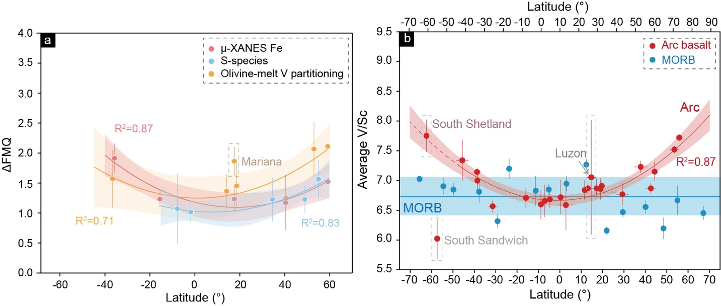 图1 岛弧橄榄石熔体包裹体氧逸度(a)、岛弧玄武岩V/Sc比值(b)与纬度的关系