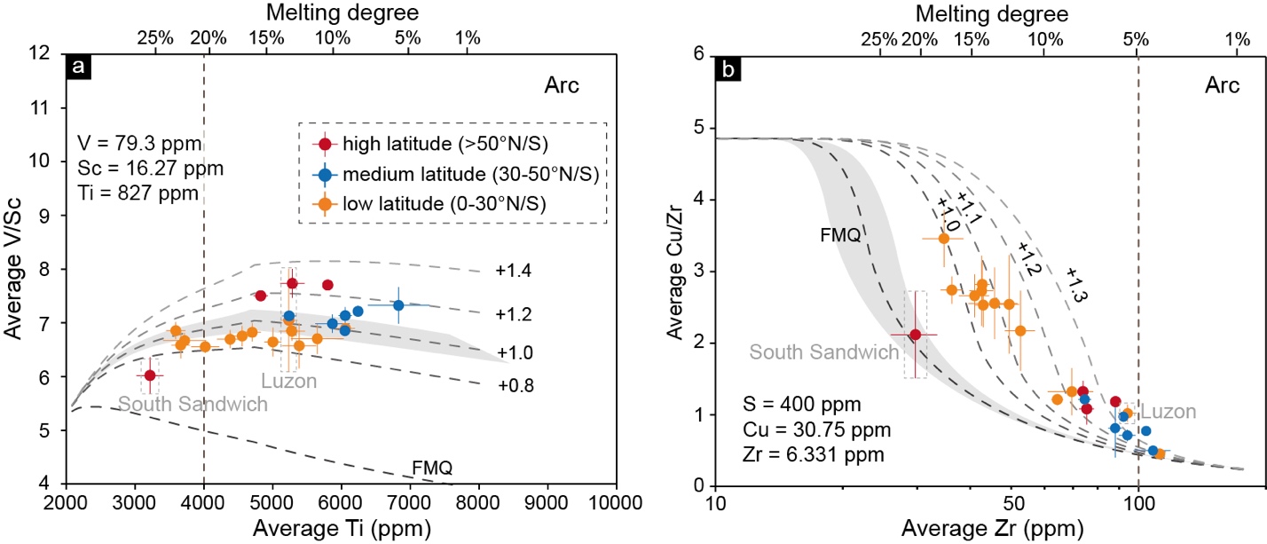 根据统计的全球岛弧带内橄榄石熔体包裹体数据,可以发现这些熔体包裹体的氧逸度具有一定随纬度变化而变化的规律,具体表现为低纬度岛弧地区的氧逸度相对较低(图1a)。但是,由于这些熔体包裹体数据有限,且对于其能否真实反映原始岩浆的氧逸度目前仍有一定争议,因此在此基础上进一步统计了岛弧玄武岩的全岩微量元素数据。统计结果显示,岛弧玄武岩的V/Sc比值与纬度具有良好的相关性(图1b),即在低纬度地区较低,而在高纬度地区较高。根据地球化学的模型计算表明(图2a),在一定条件下,V/Sc比值可以与岩浆氧逸度直接对应,因此岛弧玄武岩的V/Sc比值表明低纬度岛弧地区的氧逸度相对较低。除V/Sc比值之外,岛弧玄武岩的Cu/Zr比值也在一定程度上反映了这一规律(图2b)。因此,根据统计的数据结果可以发现,岛弧玄武岩的氧逸度具有纬度控制的特征,这表明岛弧地幔的氧逸度具有纬度效应。