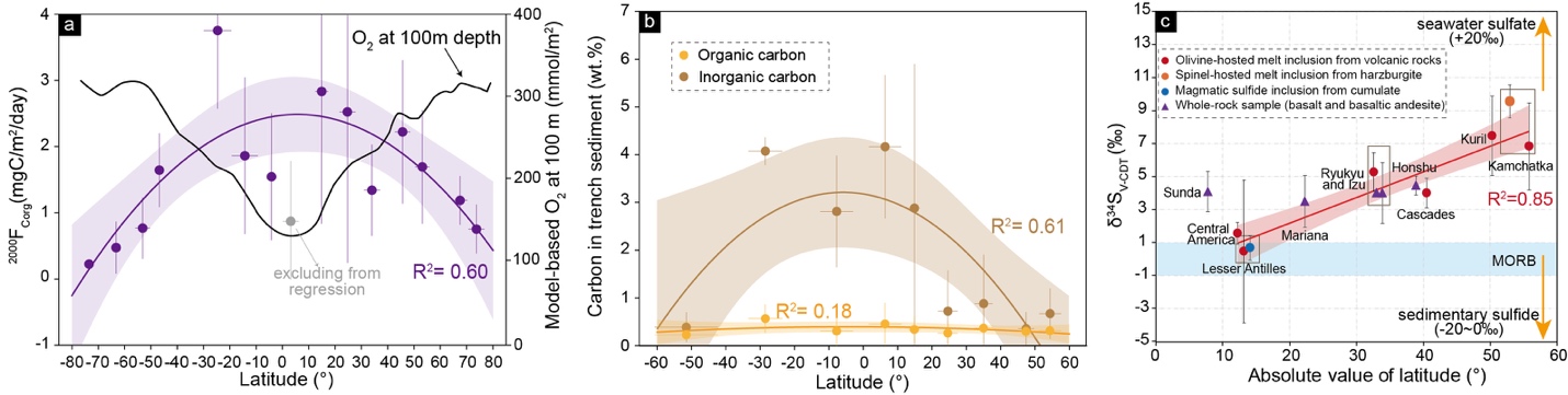 图3 颗粒有机碳(POC)(a)、俯冲沉积物碳含量(b)以及岛弧橄榄石熔体包裹体硫同位素组成(c)随纬度的变化