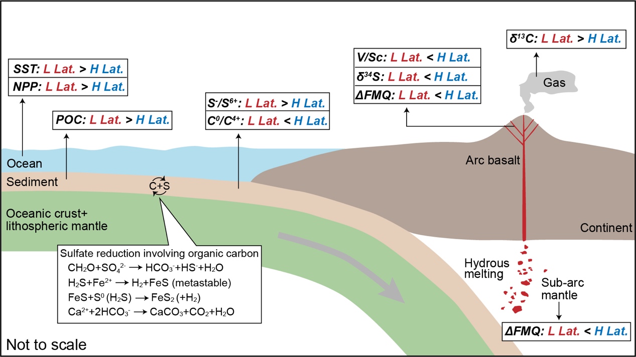 由于俯冲带热结构与纬度之间没有明显相关性,因此对于导致上述现象的原因,最可能的解释便是低纬度地区有更多相对还原的物质进入俯冲带。通过统计太平洋内颗粒有机碳(POC)随纬度的分布规律,结果显示低纬度地区有更多的POC会沉淀到大洋地壳上(图3a)。然而,根据钻孔数据表明,俯冲沉积物中的有机碳并没有明显的随纬度而变化的特征(图3b)。这样的不一致现象可以通过大洋地壳内发生的碳硫相互作用进行解释,即有机碳与硫酸盐发生反应,形成硫化物。根据地幔的初始氧化还原状态(S2-),硫化物(S-)的加入同样可以导致岛弧地幔的氧化,但是其氧化能力显然要弱于硫酸盐。因此,相比于高纬度地区,低纬度地区俯冲带可能有更多的硫化物加入,这也得到了橄榄石熔体包裹体中硫同位素数据的支持(图3c)。因此,上述过程反映了由于太阳辐射导致的随纬度变化的地表环境对地幔氧逸度的影响(图4)。