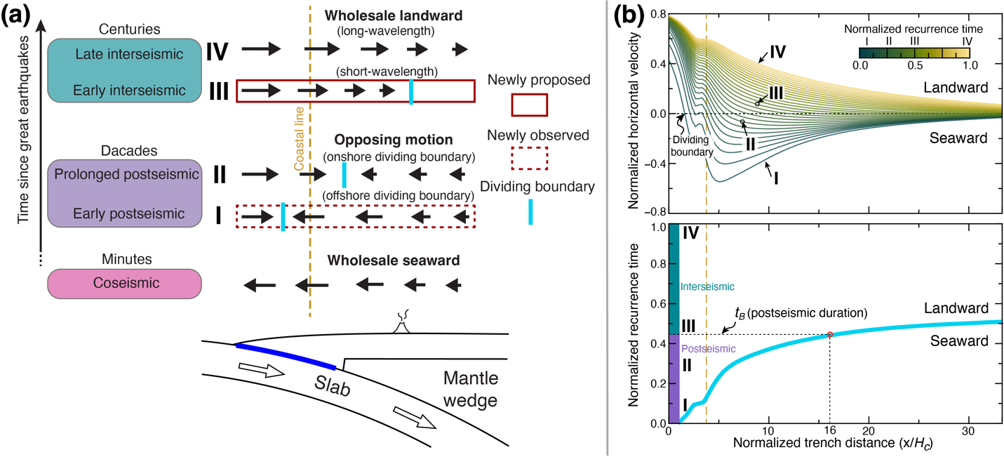 21世纪以来,通过海底GNSS等新的观测和新的理论研究,已在理解处于不同地震周期子时期的水平形变特征方面取得重要进展,但对于大地震的地震周期形变完整演化过程,还缺乏系统性、框架性认识。另一方面,全球气候变化下的表生过程研究(如海平面上升、地面沉降等),需要更精细的地震形变模型定量分离固体地球垂向形变分量,克服垂向形变观测信噪比相对低、量值相对较小但蕴含物理过程相对复杂等问题,进而深入研究圈层耦合下的表生过程。针对上述两方面问题和需求,中国科学院地质与地球物理研究所岩石圈演化与环境演变重点实验室李绍阳特聘研究员和陈凌研究员在前人工作的基础上,总结俯冲大地震震后四个子时期水平形变特征的最新认识(图1a),并设计仅与时间和空间相关的两个无量纲参数(即地震复发周期与黏弹性松弛时间之比T/tM、发震层厚度与上覆板块弹性厚度之比D/Hc),进而构建由这两个参数控制的普适性黏弹性地震周期模型。该模型预测的地表形变连续时空变化特征能自洽地解释所有水平观测(图1b),证明虽然不同俯冲带现今可能处于地震周期的不同子时期(即图1中的I-IV),但它们都遵循相同的地震周期性演化物理过程,即俯冲大断层周期性锁滑过程及与此耦合的地幔黏弹性松弛过程。基于该普适性模型,研究者进一步预测出时空连续的水平和垂向地震周期形变特征,进而:1)绘制出大地震震后/震间持续时间相图(图2a),发现现今俯冲带观测存在关键时空空白(图2b);2)揭示3个关键垂向形变特征(图3)及其时空变化(图4),从而提出俯冲带黏弹性地震周期形变及其动力学内涵的新认识。