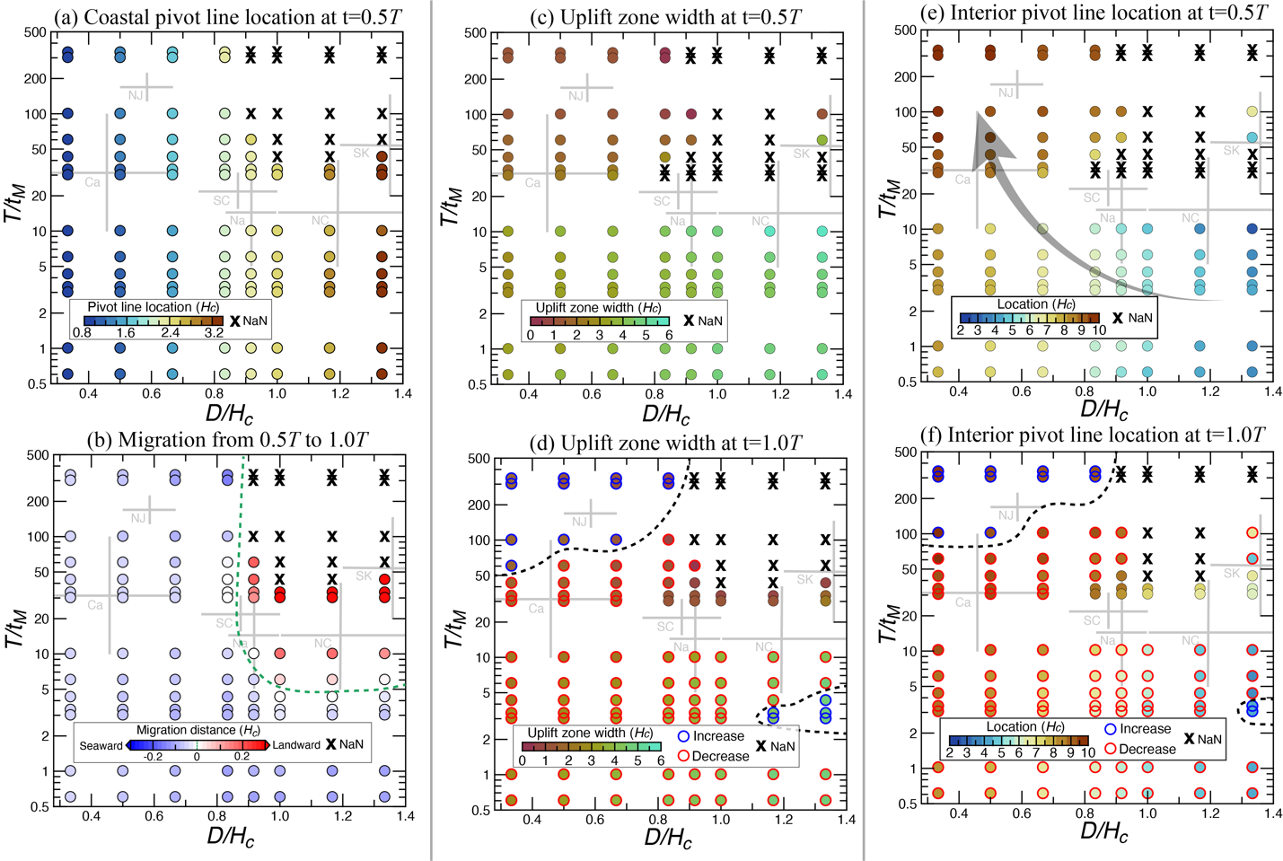 研究者进一步系统研究了T/tM和D/Hc对上述3个垂向特征时空变化的控制作用,结果显示:1)CPL空间位置主要受控于D/Hc(图4a),因此该特征可直接指针断层闭锁深度;CPL向海洋方向迁移可以同时反映T/tM和D/Hc(图4b红点)。2)UZ的宽度主要受控于T/tM(图4c、图4d),因此该特征可表示地幔黏度或地震复发时长。3)IPL空间位置同时受控于T/tM和D/Hc。这些结果充分说明垂向地壳形变包含丰富的俯冲带动力学信息,具有很高的观测价值。同时,研究结果也可以辅助设计台站的布设,例如,仅需在海岸线附近或弧后区垂直于海沟方向布设几台永久GNSS站,即可捕获CPL或IPL信号,指示俯冲系统关键物理参数。